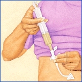 Hay dos tipos de jeringas y sondas de alimentación. Algunas tienen una conexión que permite conectar o introducir la jeringa en la sonda de alimentación. Hay un nuevo tipo de jeringa y sonda de alimentación que tiene una rosca en el conector de seguridad. Esto implica que usted debe usar un tipo específico de jeringa que se enrosca en la sonda de alimentación. El equipo de atención le dará las instrucciones para su tipo de tubo. También se le puede indicar que enjuague el tubo con agua antes y después de las alimentaciones para evitar obstrucciones. Siga las instrucciones del equipo de atención.