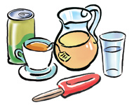 Drinks. Have plain water, sports drinks (like electrolyte solutions), drinks without caffeine, mineral water (plain or flavored), and clear fruit juices. Don't have drinks with caffeine or citrus juices. This is because they are high in acid and can irritate your stomach.