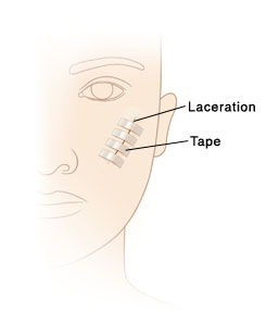 A laceration is a cut through the skin. This may require stitches if it is deep. Minor cuts may be treated with surgical tape.